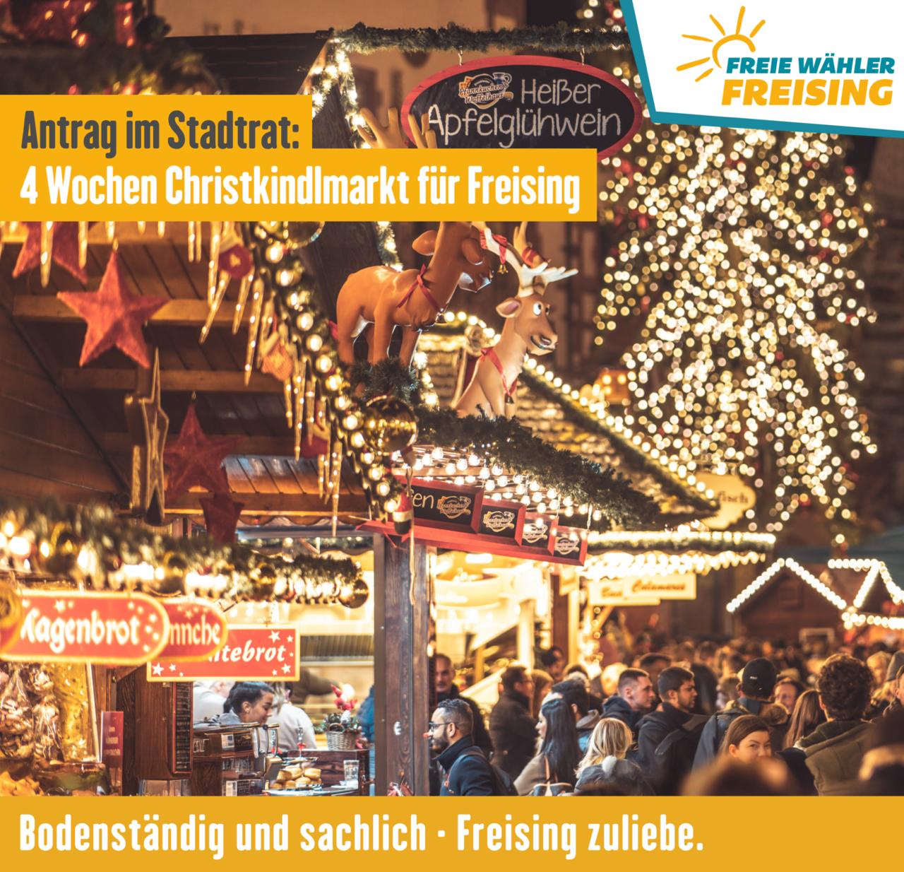 In ihrem Antrag verweisen die Freien Wähler darauf, dass es zwar den traditionellen und beliebten caritativen Christkindlmarkt auf dem Marienplatz gebe, jedoch keine mehrwöchige Veranstaltung mehr. Gerade eine solche könne in der Vorweihnachtszeit ein beliebter Treffpunkt sein, die Innenstadt beleben und Besucher von außerhalb anlocken. „Ich kenne viele Freisingerinnen und Freisinger, die auf die Christkindlmärkte nach Landshut, Erding und Pfaffenhofen fahren oder den Wintermarkt am Flughafen besuchen“, erklärt Weller, der die Idee für den Antrag hatte. Deshalb sollte man von Seiten der Stadtverwaltung trotz der angespannten Haushaltslage einen Versuch unternehmen, eine solche Veranstaltung in Freising zu etablieren.